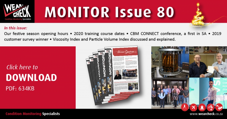 As we near the finish line for 2019, our final edition of Monitor newsletter is released. In it, you’ll find details of our holiday opening hours, and useful explanations of Particle Volume Index (PVI) readings and the Viscosity Index. Our ever-popular Lube Tip is there, along with news of important upcoming events on the condition monitoring calendar, 2020 training course dates (oil analysis training and Mobius courses) and other news of training sessions, expos and some outstanding achievements by our staff. You can read all about it here http://www.wearcheck.co.za/shared/M80.pdf