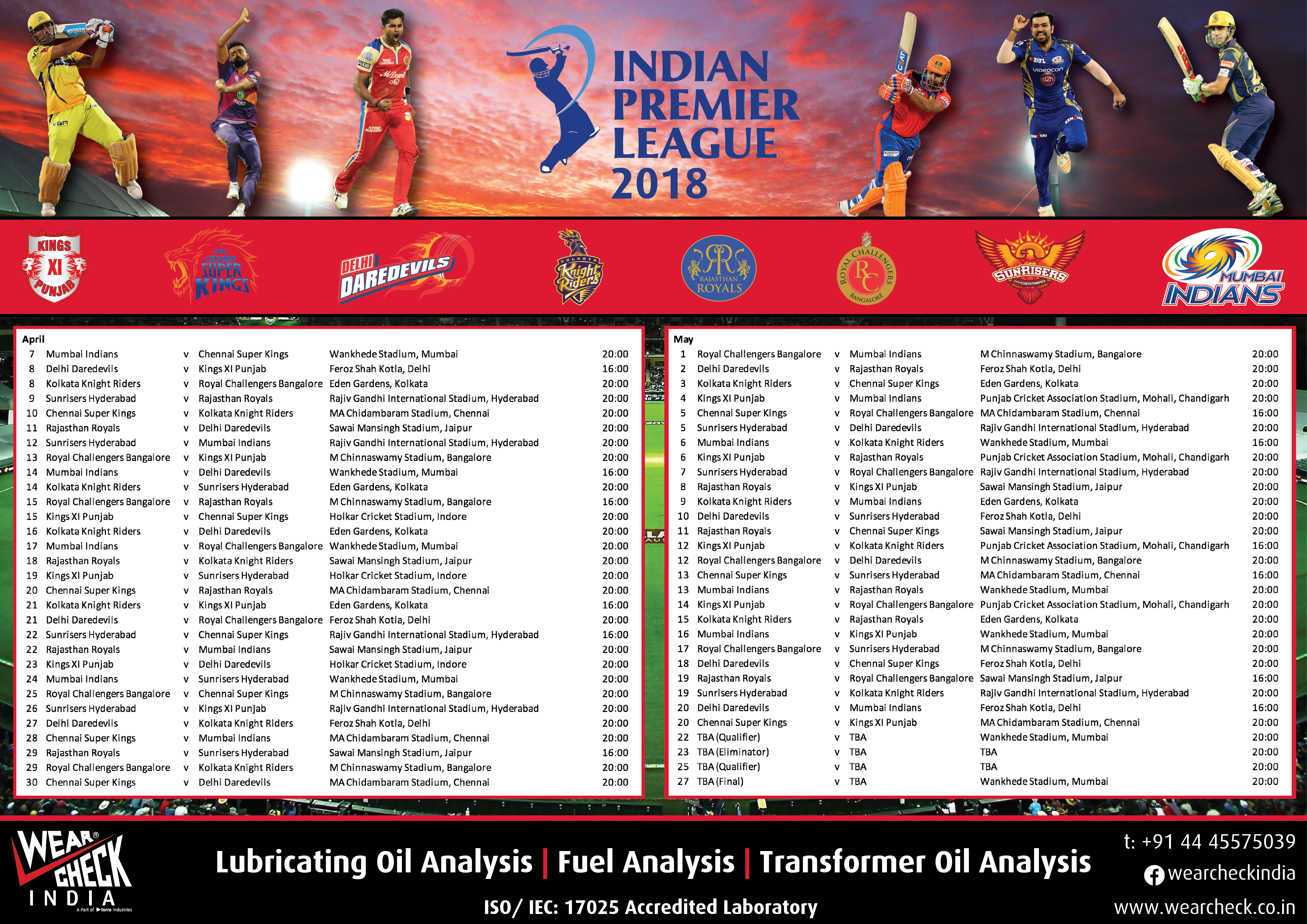 With WearCheck’s special 2019 IPL fixture lists, we have made it easier for our fellow cricket fans to follow your favourite players and teams.